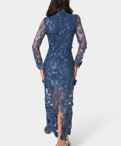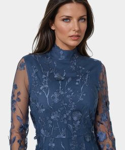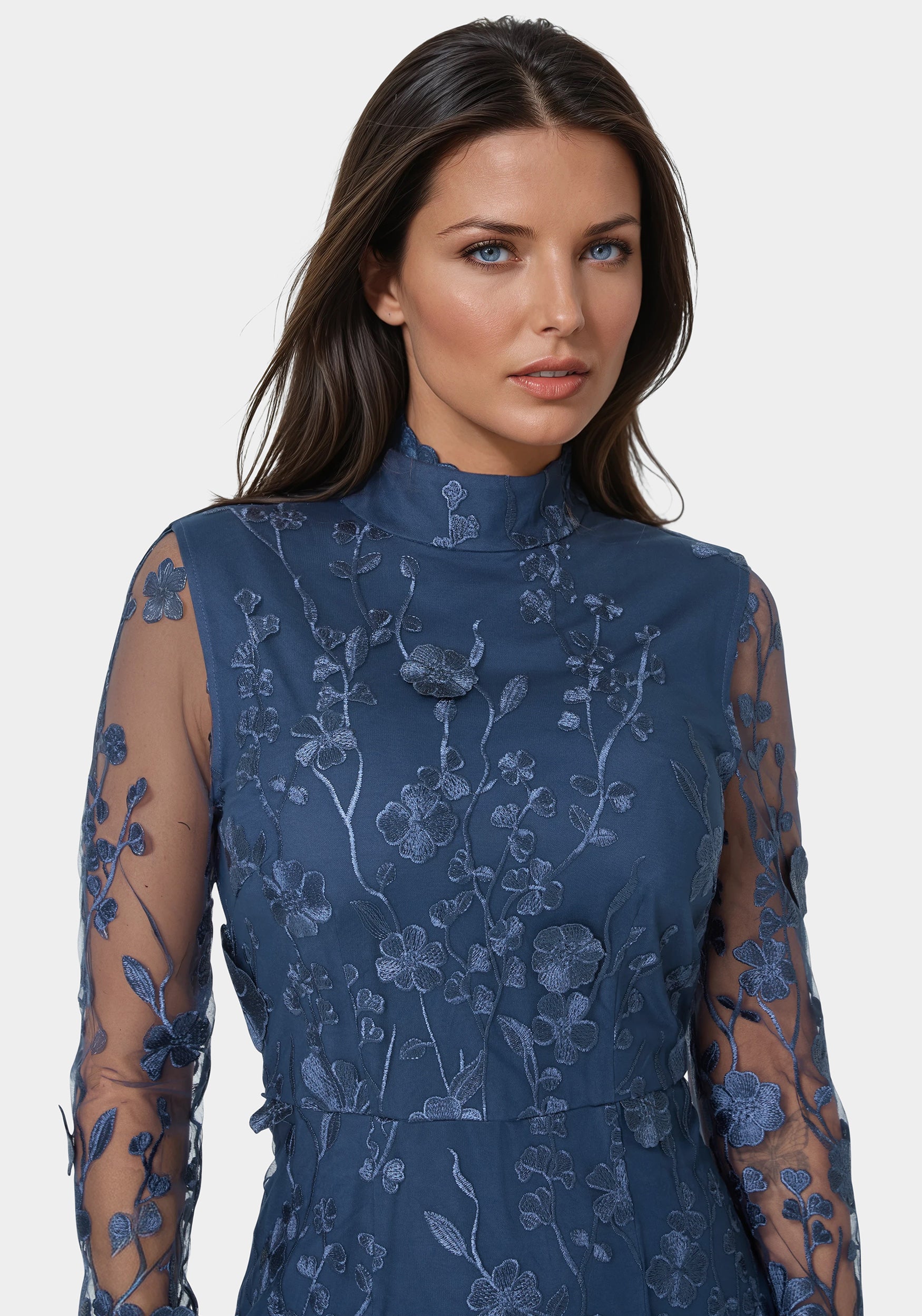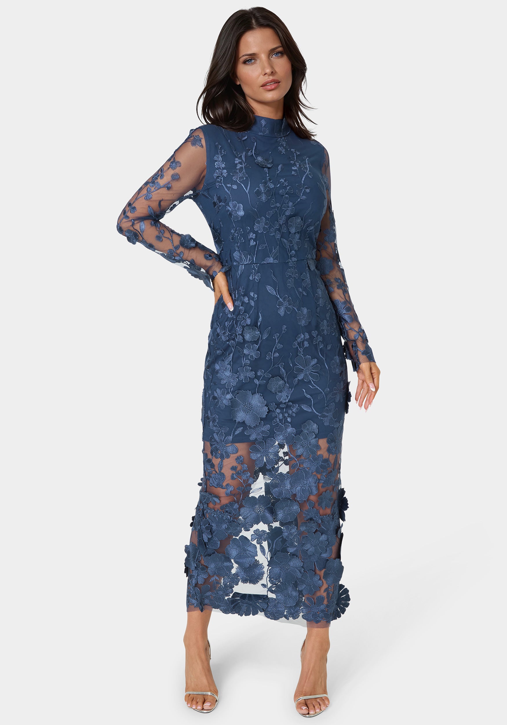 Long-sleeve mockneck midi embellished with 3D florals; a beautiful fit for elegant dinners or unique occasions.