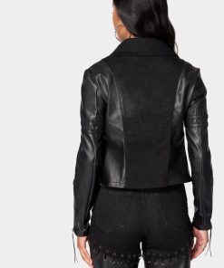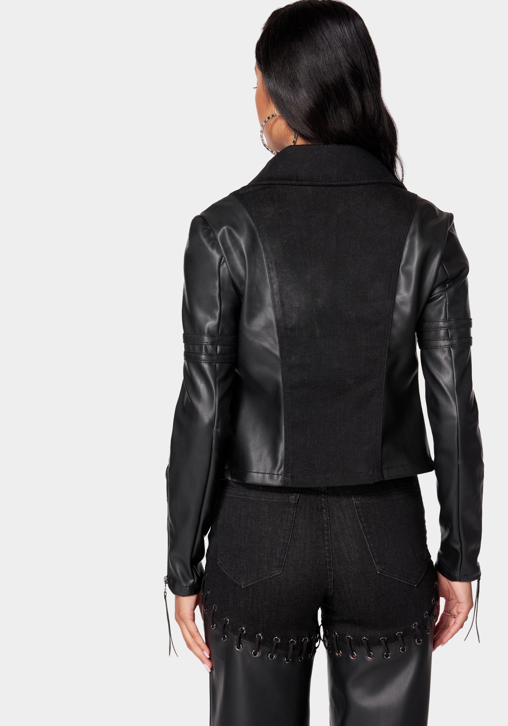 Unleash your inner fashionista with our denim combo vegan leather motto blazer. This blazer combines the rugged coolness of denim with the sleek sophistication of vegan leather, creating a unique look that’s both edgy and sophisticated. This blazer is perfect for layering over a graphic tee for a cool, casual vibe, or over a dress for a more dressy and bold statement.