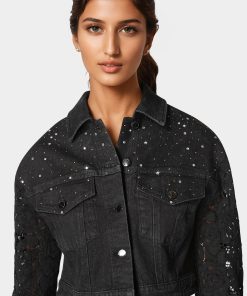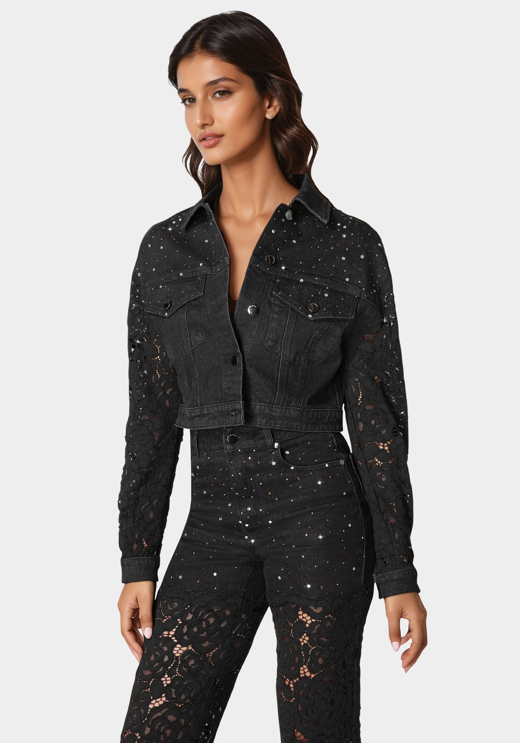 Reinvent casual chic with this unique denim jacket, featuring drop shoulders and intricate lace embellishments. Perfect for adding a touch of elegance to your day-to-night look.