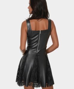 Faux leather flare dress with lace insets and a sleeveless design; a unique look for art shows or night outings.