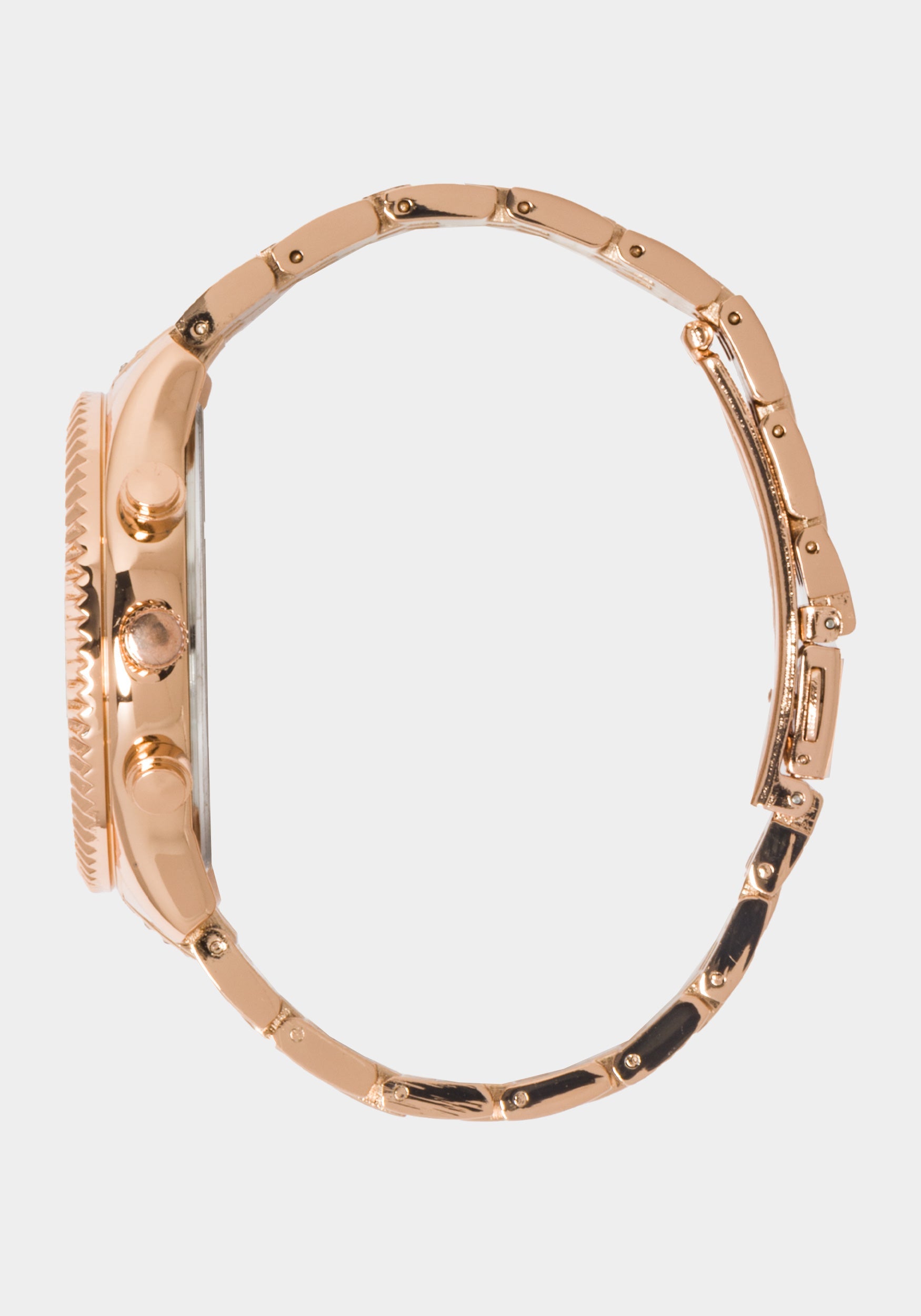 Distinctly luxurious, this rose gold-tone watch features a crystal-embellished bezel and dial with rose gold-toned hands, complete with clear pavé crystals along the chain.