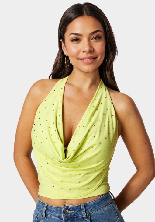 Command attention in this alluring halter top with a draped design and glittering accents. Perfect for upscale dinners or stylish nights out.