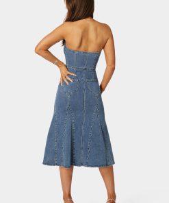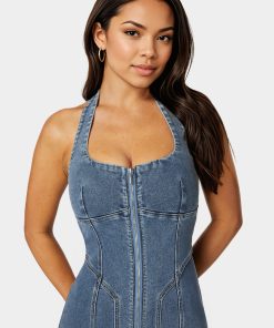 Show off your style with the halter front zipper midi denim dress. Perfect for concerts or a night out, its edgy halter design and functional zipper detail offer a modern twist on a classic look.