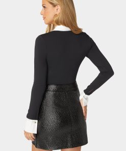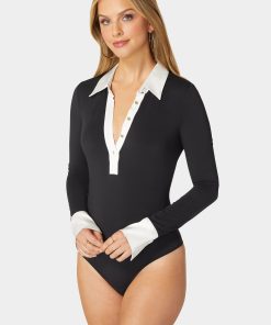 Feel the seamless blend of casual and enticing with the Henley Satin Combo Knit Bodysuit. Wear it under a light cardigan for an art gallery visit or paired with sleek jeans for a look that transitions beautifully from day to night.
