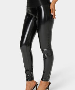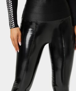 Shiny vegan leather and a high waist create stylish allure; great for bold, urban styles.