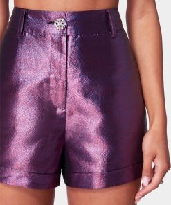 Revamp your wardrobe with these high waist iridescent jacquard shorts. The luminous fabric paired with a contemporary high-waisted design provides a look that’s both chic and comfortable. Complete the look with the ruffle sleeve iridescent jacquard top.