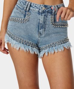 Elevate your warm weather wardrobe. High-waist, studded denim shorts offer a chic, daring edge to casual looks.