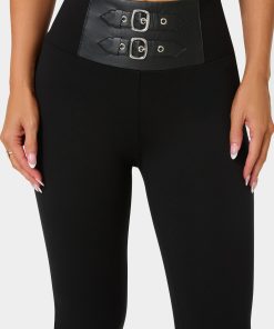 Edgy high waist leggings with a belt detail boast vegan leather shine; perfect for trendy outings.