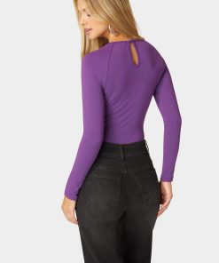 Bebe Women’s Mesh Combo Front Twist Knit Bodysuit | Imperial Purple