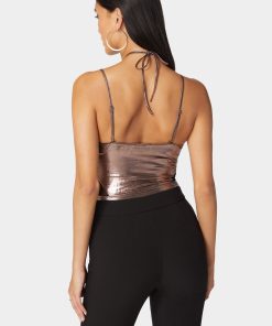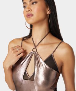 Step into luminous allure with the Metallic Foil Halter Neck Mesh Combo Bodysuit. This piece is a dance between daring and delight, featuring a halter neck that bares with confidence and a metallic foil that catches every eye. Mesh detailing whispers secrets of what’s beneath, making this bodysuit a key to unlocking nights filled with intrigue and empowerment.
