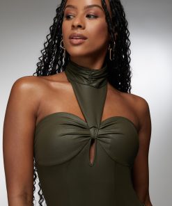 Step into the spotlight with the bebe x Ciara mock neck bodysuit. Embody the night with its striking coated knit that hugs every curve with precision. This bodysuit stands out with its daring halter neckline, ensuring all eyes are on you. Perfect for layering under a blazer or wearing solo, it’s your go-to for making every moment unforgettable. Own your power, own your style, own the night.
