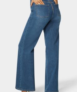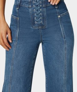 Fashionable wide-leg jeans with decorative lace-up front and metal back zipper. Offers a comfortable yet stylish look for casual or trendy occasions.