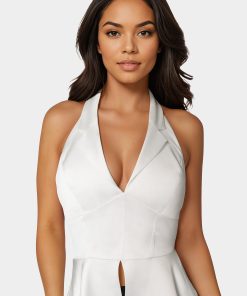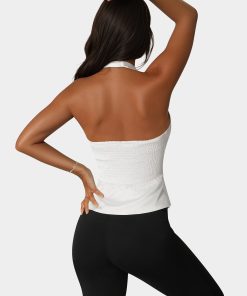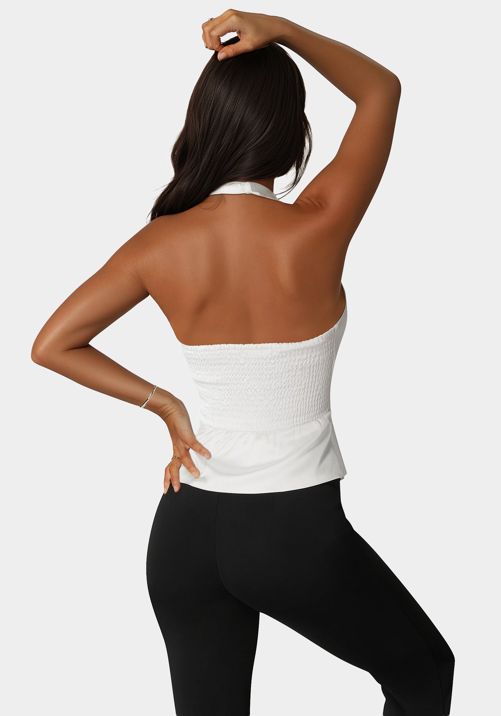 Sleek satin meets effortless sophistication with this halter neckline top, ideal for upscale evening events, summer dinners, or cocktail receptions. Flattering yet comfortable with smocked detailing.