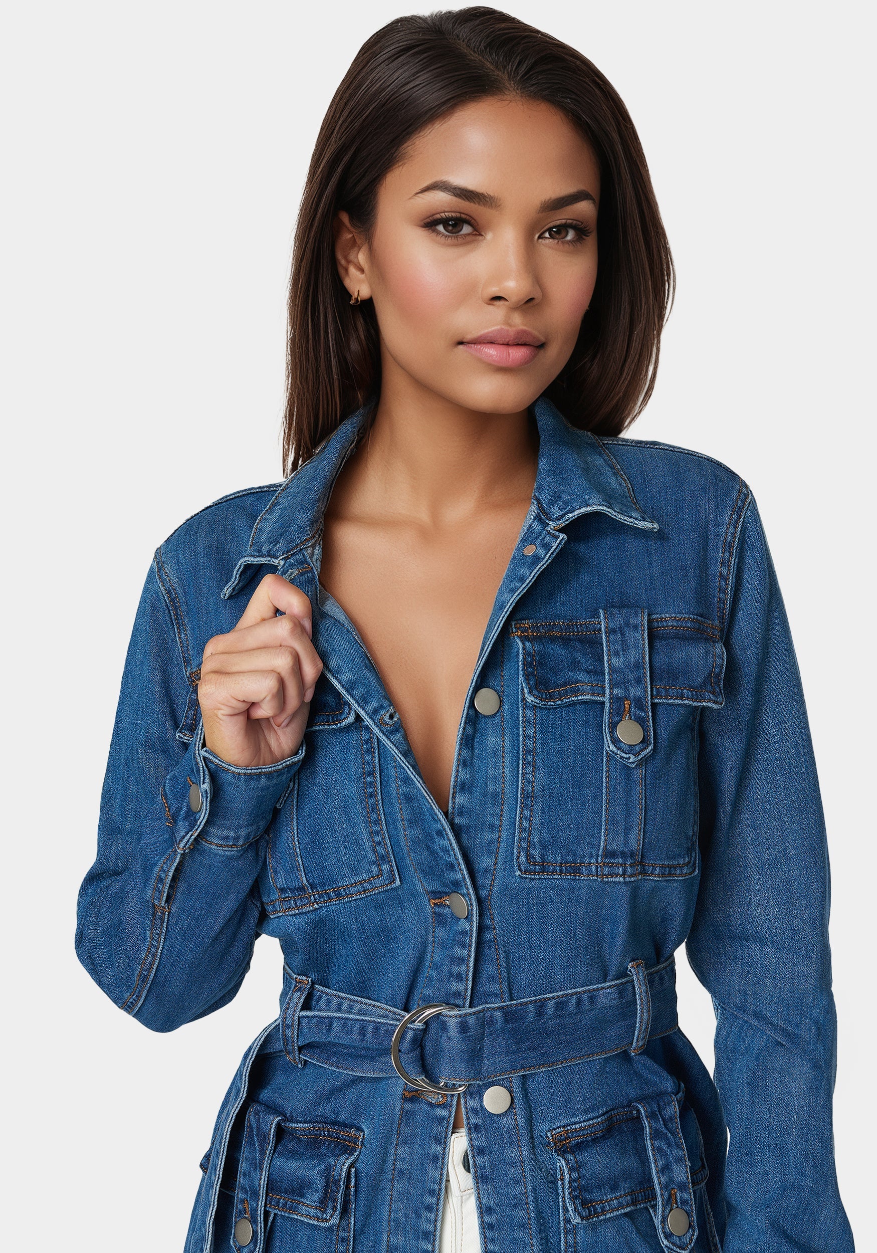 Embrace a sultry and chic style with our Semi-Fitted Utility Denim Jacket. The semi-fitted silhouette accentuates your curves, while the utility details add a touch of edge. With a confident stride, you’ll turn heads and make a statement with your irresistible charm.