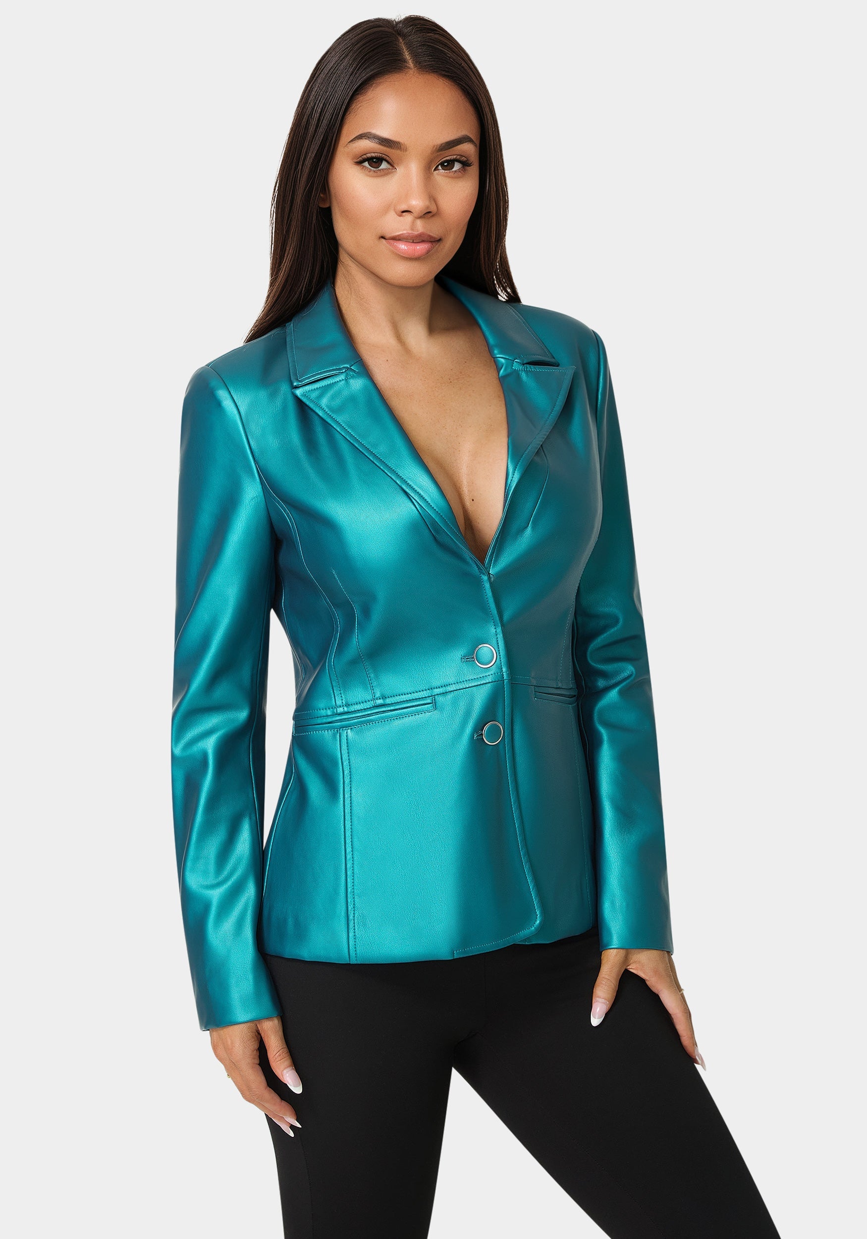 The Tailored Metallic Vegan Leather Blazer is an audacious twist on a timeless piece. Perfect for networking events or avant-garde art show openings, this piece reflects your bold, barrier-breaking style.