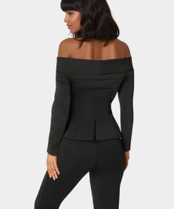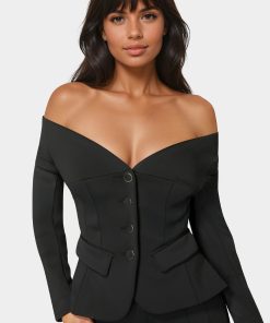 Fitted off-shoulder blazer with stretch fabric and button closure, perfect for evening events or formal office attire.