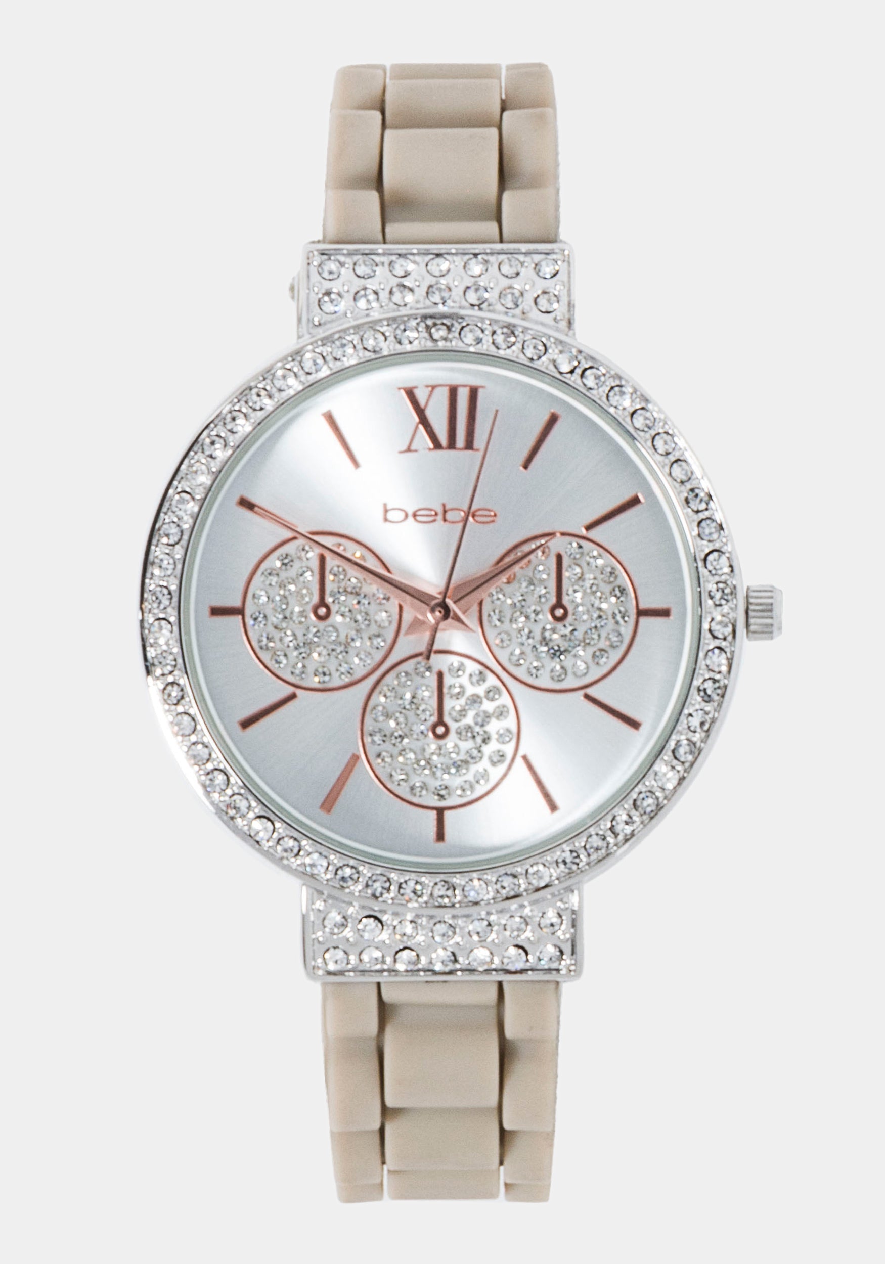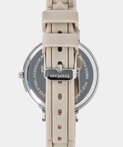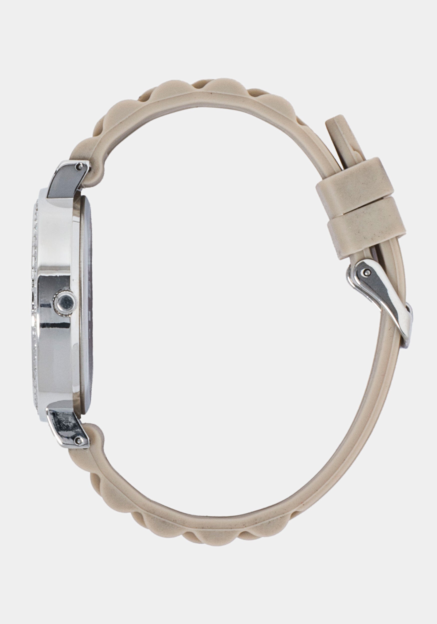 A dainty shape define this elegant day-to-night watch featuring a square design, crystals on the bezel, a taupe link strap.