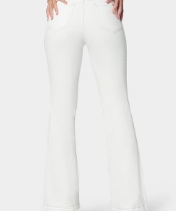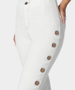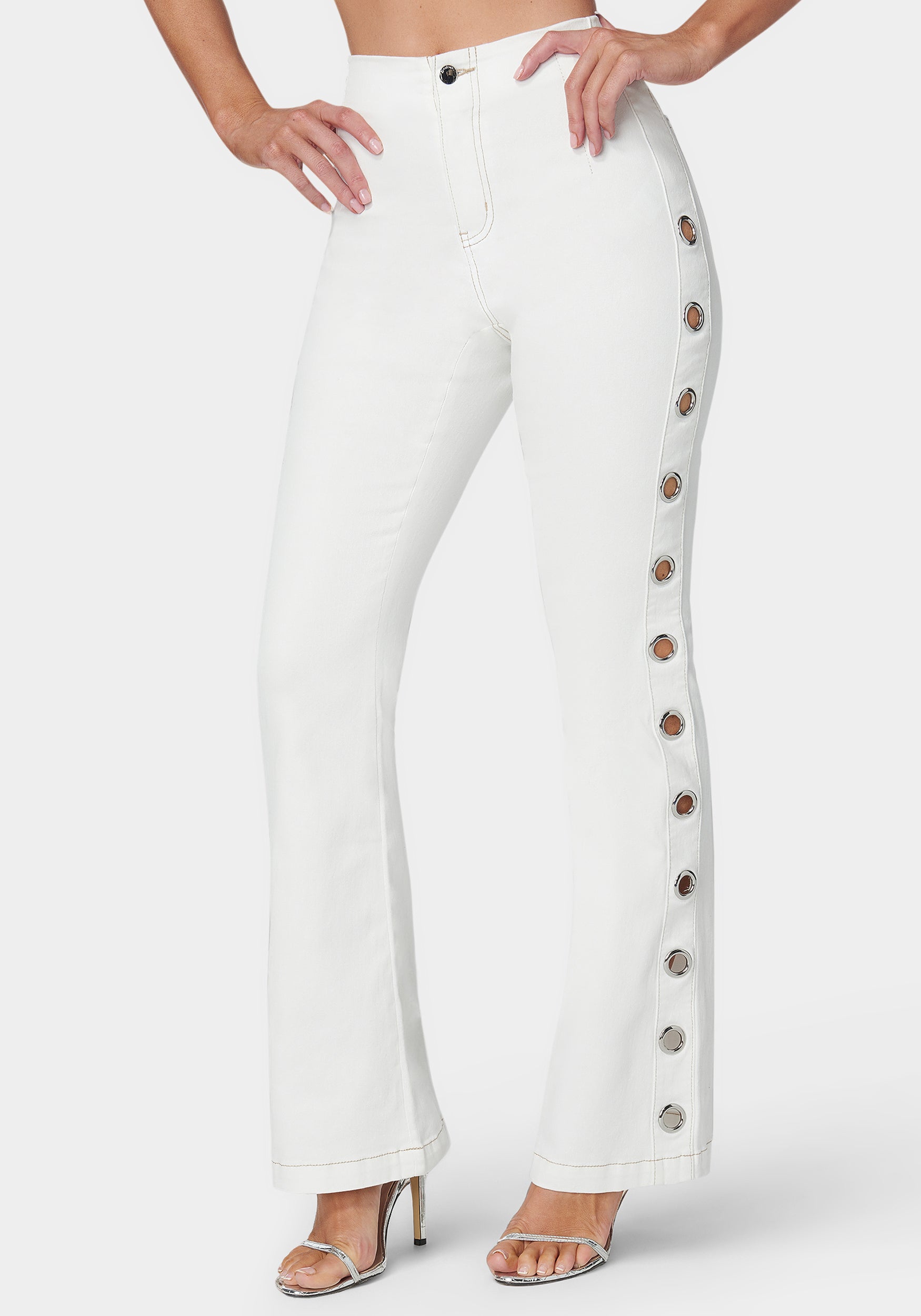 Experience a bold, vintage-inspired look. These white, high-waist jeans feature a flared cut and eye-catching grommet details.