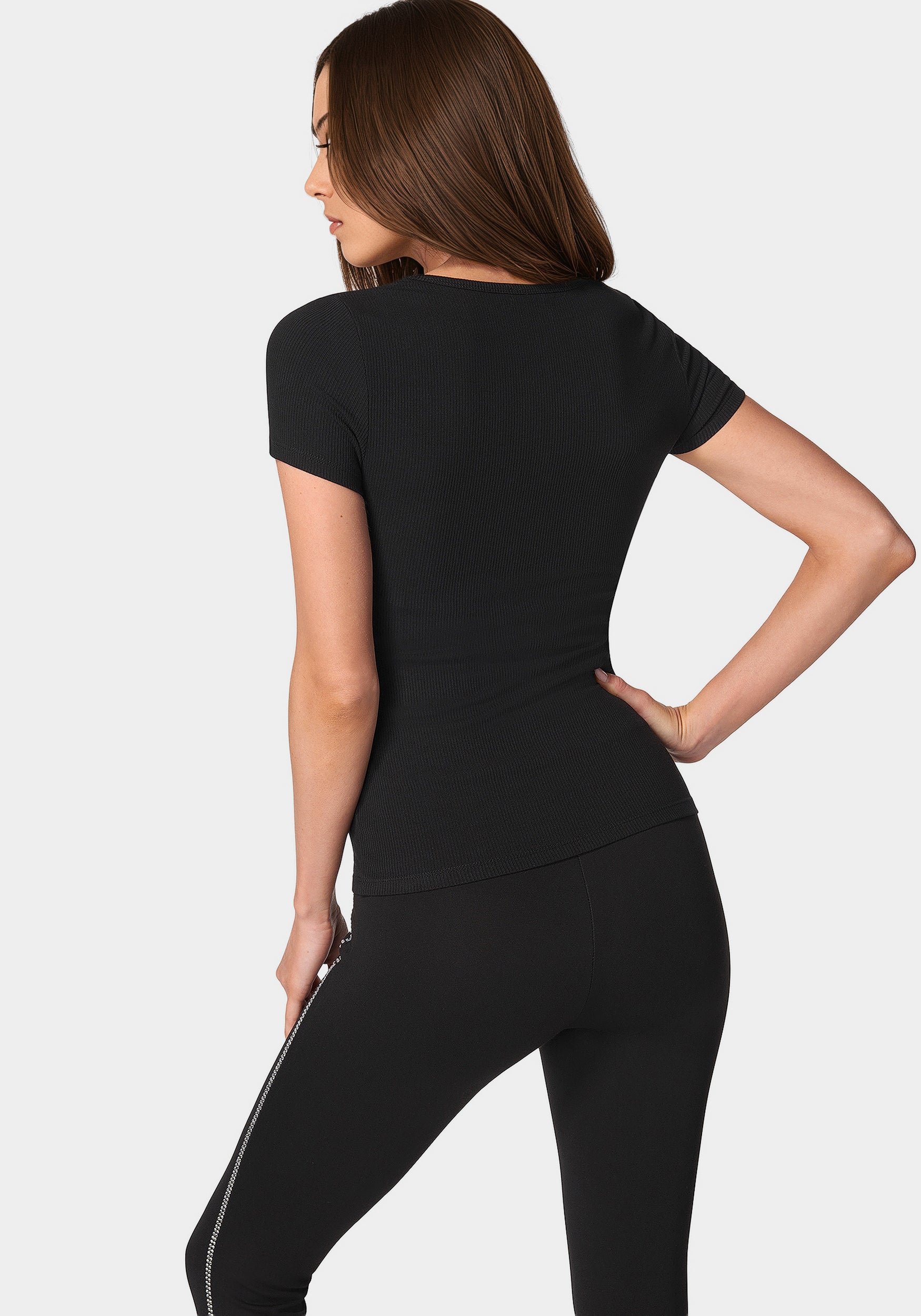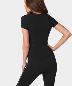 Evoke the essence of understated elegance in the Bebe Logo Short Sleeve Scoop Neck Single Stone Rib Top. Crafted to transition seamlessly from day to night, this top features a classic scoop neck enhanced by a single, shimmering stone—a testament to refined allure. It’s designed for the woman who moves with grace and speaks in styles that resonate with timeless sophistication, a subtle nod to those who understand that sometimes, less truly is more.